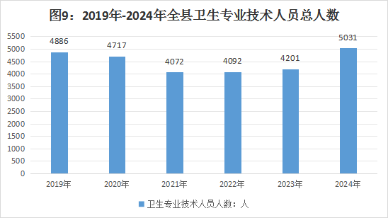年末全县共有医疗卫生机构721个,其中县级医院4个、妇幼保健院1个、乡镇卫生院38个、疾病预防控制中心1个、社区卫生服务中心(站)6个、诊所(卫生所、医务室)178个、村级卫生室477个。年末共有卫生专业技术人员5031人,其中执业医师1335人、执业助理医师780人、注册护士2285人、药师(士)136人、技师(士)261人。年末医疗卫生机构共有床位5189张,其中,医院2874张、卫生院1946张、妇幼保健院100张。全年医疗机构总诊疗人数469.93万人次,比上年增长1.0%,其中,住院入院19.33万人次,增长6.1%;出院19.35万人次,增长6.0%。全年儿童疫苗接种人数63884人,儿童计划免疫疫苗接种率达93.8%。(图9)