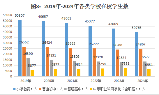 年末全县共有各级各类学校98所。其中,幼儿园23所、完全小学26所、九义校41所、高完中5所、职业高中1所、中等职业学校1所、特殊教育学校1所。有在校学生84796人、专任教师7812人。职业中学全年招生1771人、在校生6551人、毕业生2267人;普通高中全年招生5025人、在校生13572人、毕业生4269人,高中升学率为89.8%;普通初中全年招生8322人、在校生24867人、毕业生8110人,初中升学率为93.3%;普通小学全年招生5491人、在校生39766人、毕业生8396人;特殊教育学校全年招生11人、在校生40人、毕业生6人;在园儿童数13059人,学龄儿童入学率为99.9%。(图8)