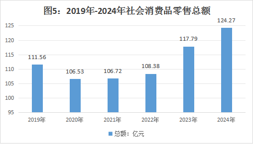 全年实现社会消费品零售总额124.27亿元,比上年增长5.5%,其中,限额以上企业(单位)实现消费品零售额31.66亿元,同比增长10.3%。(图5)