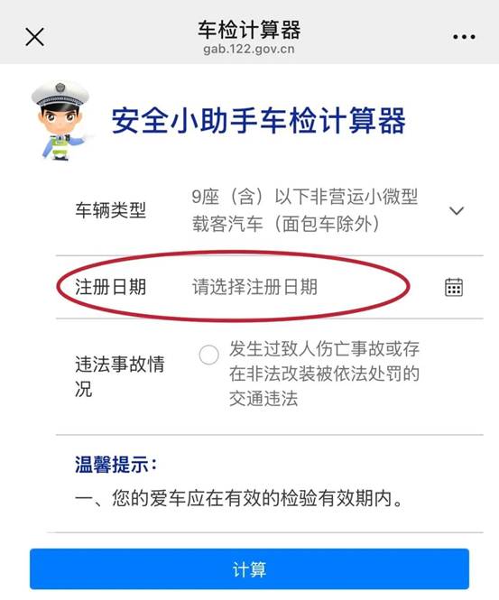 登录“公安部交通管理局”微信公众号,在“线上服务”—“车检计算器”中按照车辆注册登记时间查询检验周期。提示:查询时应确保车辆在检验有效期内,并根据实际情况勾选是否存在发生过致人伤亡事故或存在非法改装被依法处罚等不适用免检政策的情形。