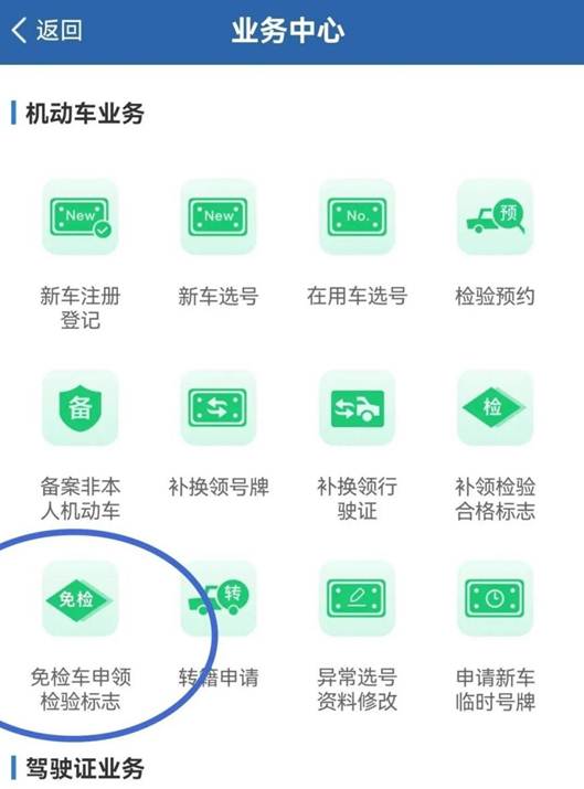 需要提示的是:免于上线检验的车辆仍需按检验有效期申领检验标志。公安部已在全国推广应用电子检验标志,您可登录“交管12123”手机APP,在“更多”—“业务中心”— “机动车业务”板块中,选择“免检车申领检验标志”,即可申领电子检验标志,不需要再申领、粘贴纸质标志。