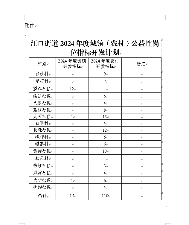 2024年办事处开发城镇公益性岗位14个,开发乡村公益性岗位110个(附件)。