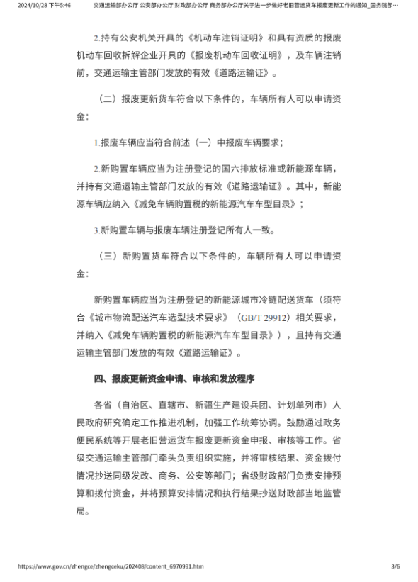 3.报废更新货车,是指报废上述货车,并购买国六排放标准营运柴油货车或新能源营运货车,并持有交通运输主管部门发放的有效《道路运输证》,且新购置车辆与报废车辆注册登记所有人一致。其中,新能源车辆应纳入《减免车辆购置税的新能源汽车车型目录》。