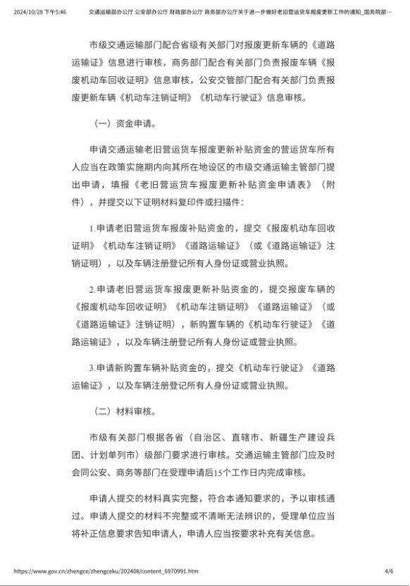3.上述《报废机动车回收证明》《机动车注销证明》《机动车登记证书》《机动车销售统一发票》应于2024年7月1日起至2024年12月31日期间取得。其中,《报废机动车回收证明》应由有资质的报废机动车回收拆解企业开具,并取得商务部门签章。《机动车注销证明》《机动车登记证书》提交截止日期可视情延长至2025年1月15日。