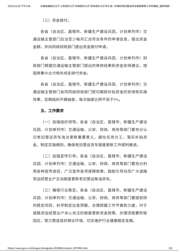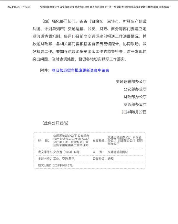 今年以来,为贯彻落实《国务院关于印发〈推动大规模设备更新和消费品以旧换新行动方案〉的通知》(国发〔2024〕7号)精神,交通运输部等国家部委先后制发了《交通运输部等十三部门关于印发〈交通运输大规模设备更新行动方案〉的通知》(交规划发〔2024〕62号)、《新能源城市公交车及动力电池更新补贴实施细则》(交运函〔2024〕390号)、《交通运输部办公厅、公安部办公厅、财政部办公厅、商务部办公厅关于进一步做好老旧营运货车报废更新工作的通知》(交办运〔2024〕44号)等文件,对超长期特别国债支持营运车辆报废更新工作作出了具体安排部署。根据《巴中市交通运输局、巴中市公安局、巴中市商务局关于进一步做好老旧营运货车、城市公交车及动力电池报废更新工作的通知》(巴市交〔2024〕194号)文件要求,现就相关事项通知如下。