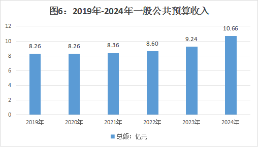 全年地方一般公共预算收入10.66亿元,同比增长15.4%,其中,税收性收入3.76亿元,同比增长15.9%。一般公共预算支出61.22亿元,同比增长3.2%。(图6)
